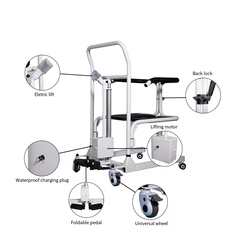 Az elektromos emelőszék kényelmes és biztonságos módszert kínál a betegek átadására. A gondozók könnyen átvihetik a betegeket ágyakba, fürdőszobákba, WC -kbe és más helyekre. A fekete -fehér kombinációja gyönyörű és stílusos. A fő test nagy szilárdságú acélszerkezetet alkalmaz, amely erős és tartós, és biztonságosan ellenáll a 135 kg terhelésnek. Nemcsak átadási székként, hanem kerekes székként, WC -székként, zuhanyszékként is használható. Ez az első választás a gondozók és családtagjaik számára.